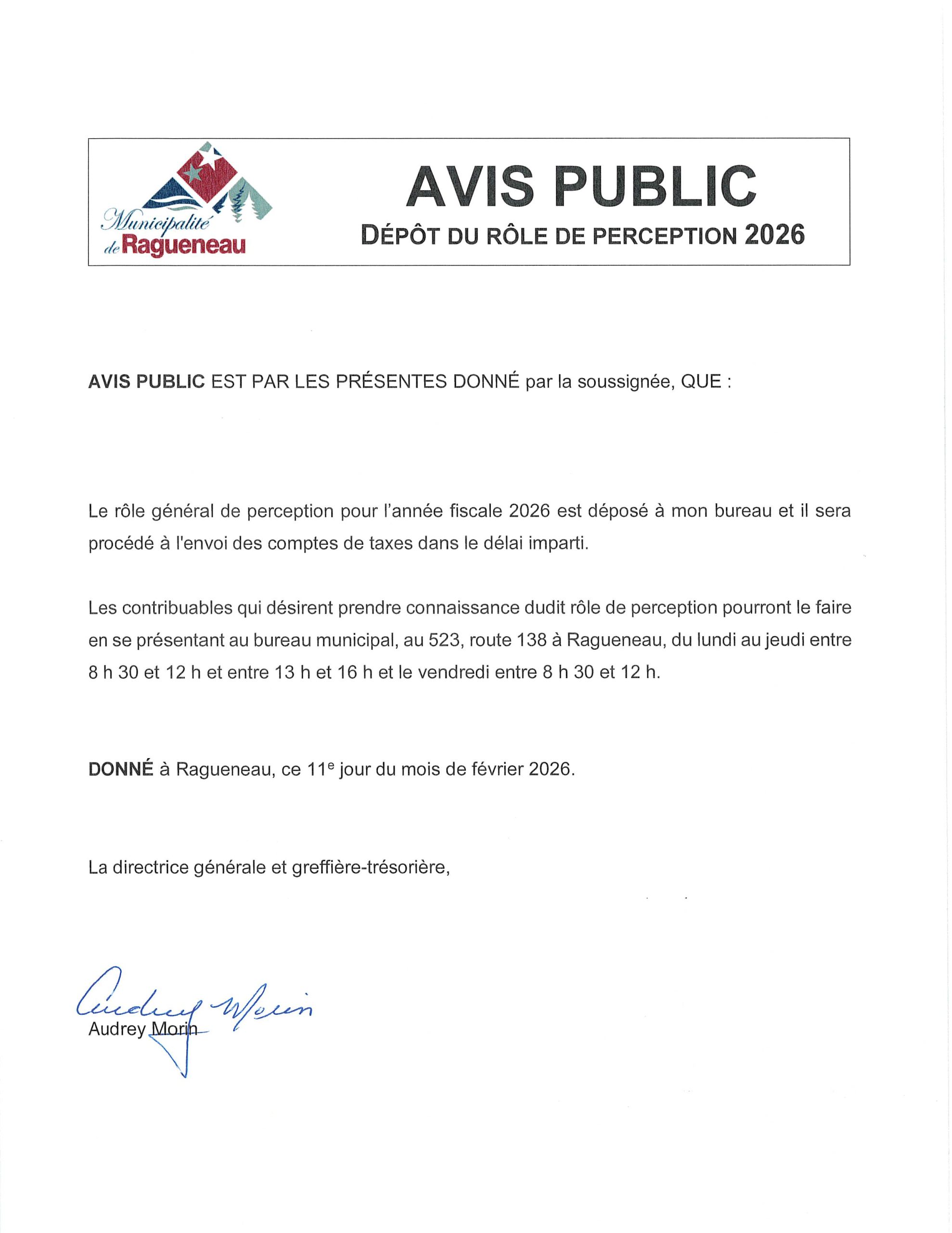 Avis public – Dépôt du rôle de perception 20262026-02-112026-02-12https://municipalite.ragueneau.qc.ca/wp-content/uploads/2018/11/logo.jpgMunicipalité de Ragueneauhttps://municipalite.ragueneau.qc.ca/wp-content/uploads/2018/11/logo.jpg200px200px