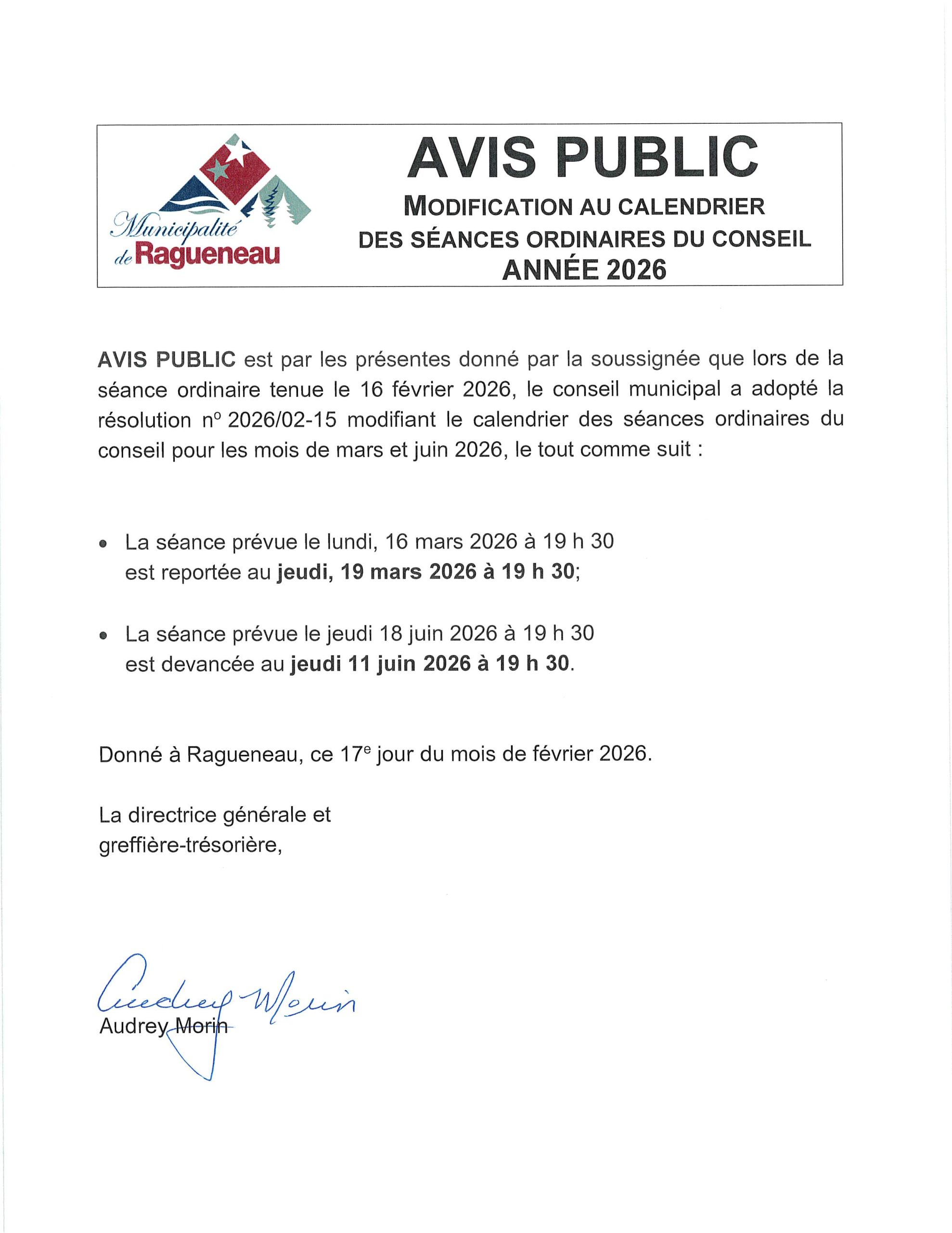 Avis public – Modification au calendrier des séances ordinaires du conseil – Année 20262026-02-172026-02-17https://municipalite.ragueneau.qc.ca/wp-content/uploads/2018/11/logo.jpgMunicipalité de Ragueneauhttps://municipalite.ragueneau.qc.ca/wp-content/uploads/2018/11/logo.jpg200px200px